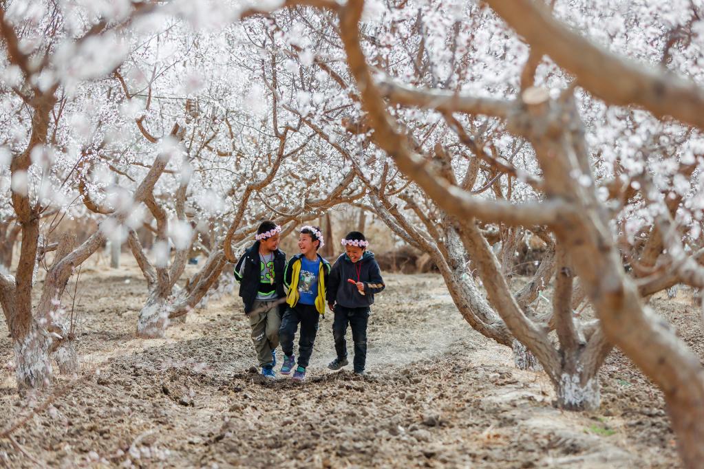 3月18日,小朋友在“新疆第一春·花開吐魯番”2023吐魯番杏花節現場游玩。新華社記者 郝昭 攝