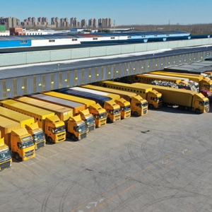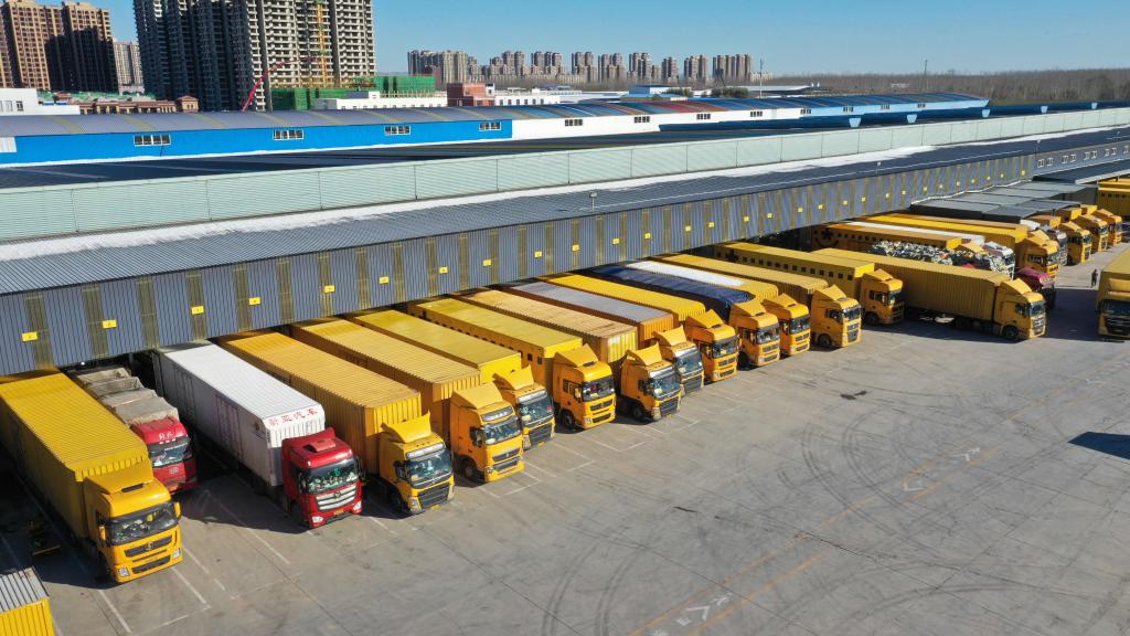 大型快遞運輸車輛停靠在韻達華北分撥中心(無人機照片)。(受訪者供圖)