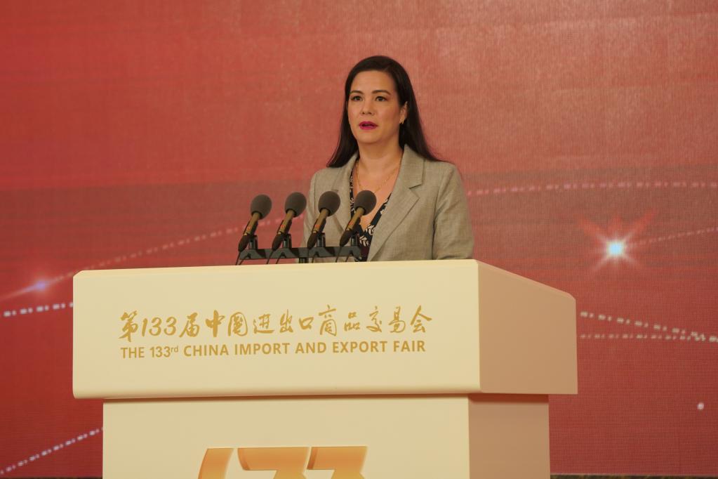 第133屆廣交會開幕式上,珍妮弗·帕頓代表科佩爾公司發言。新華社記者魏弘毅 攝