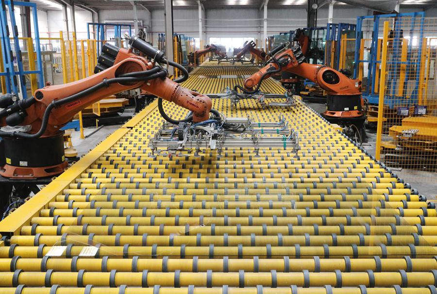 秦皇島海港經濟開發區一家玻璃企業的機器手在工作中(2023年2月17日攝)。新華社記者 楊世堯 攝