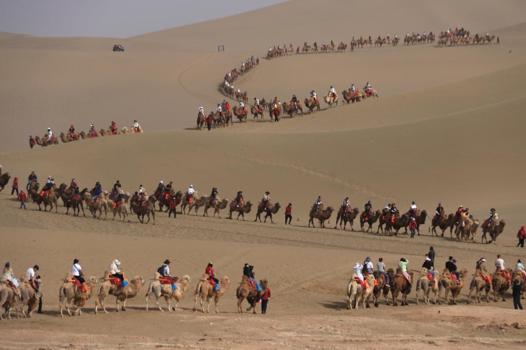 “2400多峰駱駝全部‘上崗’,從早到晚忙不過來!原本40分鐘的路程現在要走1小時左右。”敦煌鳴沙山月牙泉景區負責人說。