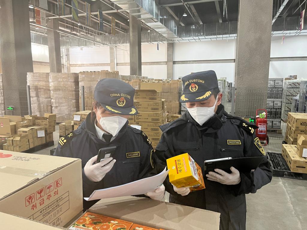 圖為曹妃甸海關關員查驗跨境電商商品。(于佺 攝)