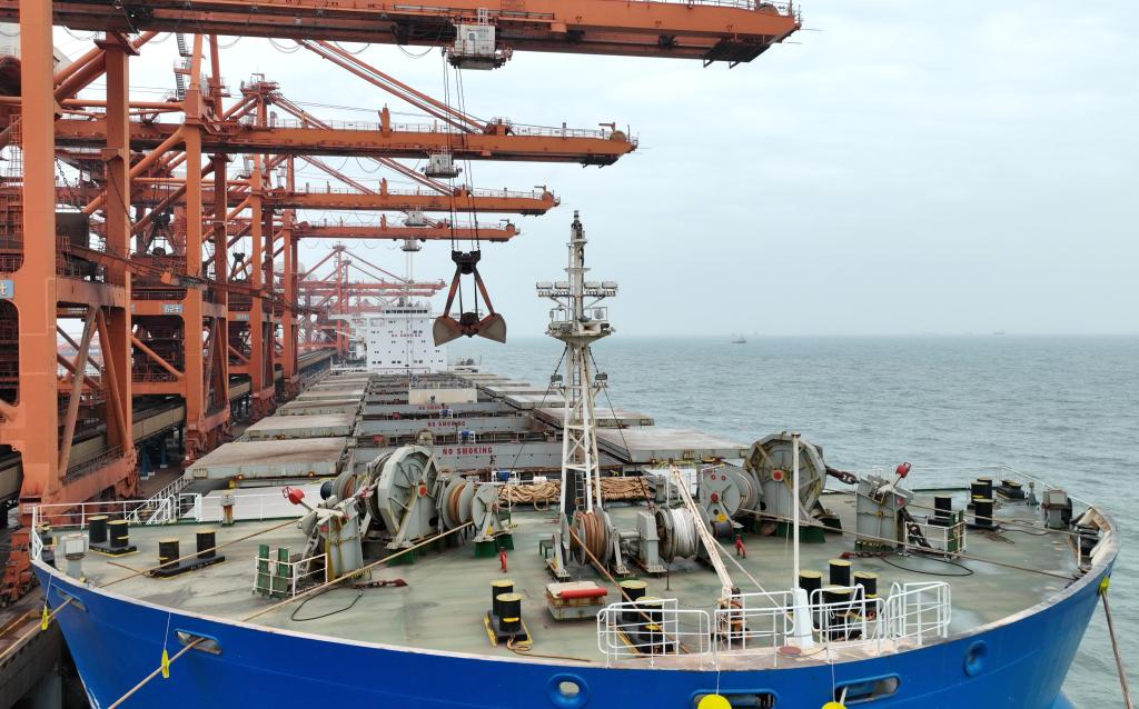 4月17日,一艘輪船靠泊在唐山港曹妃甸港區礦石碼頭(無人機照片)。新華社記者楊世堯 攝
