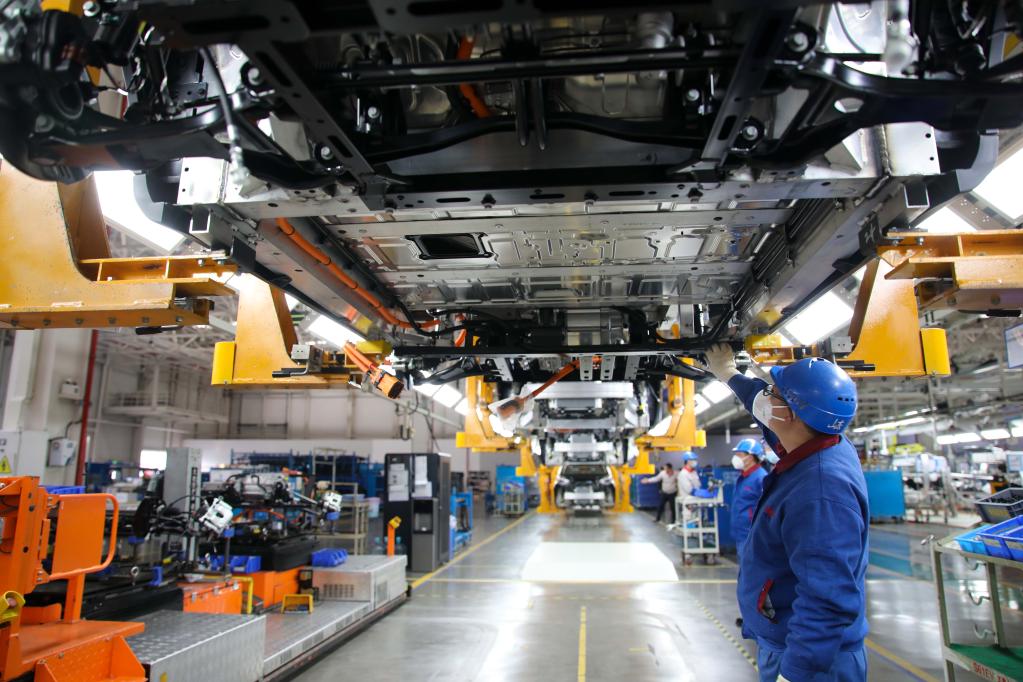 2月3日,安徽蕪湖,工人在奇瑞汽車股份有限公司新能源二期工廠總裝車間作業。新華社記者曹力 攝