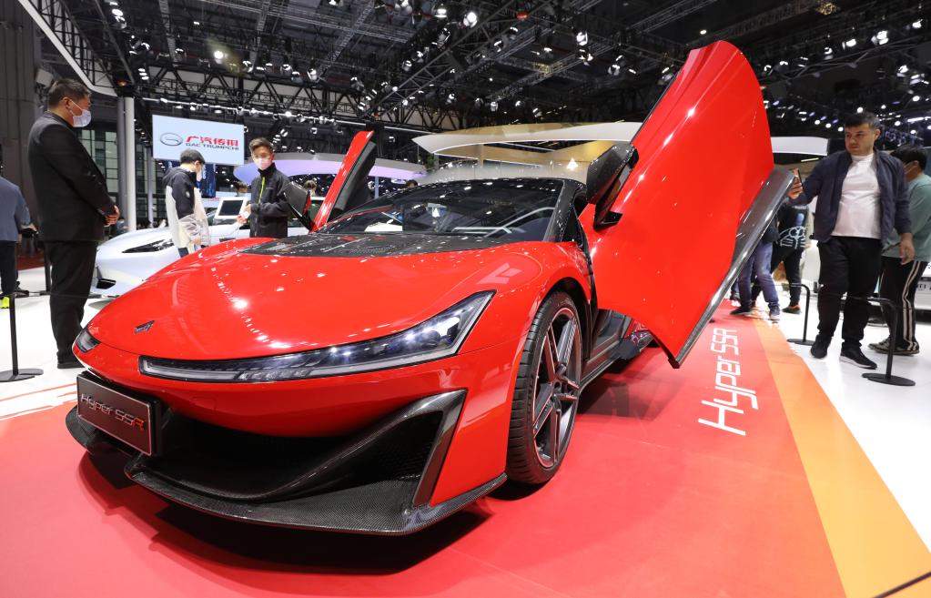 4月24日,第二十屆上海國際汽車工業展覽會上,參觀者在廣汽傳祺展臺上觀看一輛昊鉑SSR電動跑車。新華社記者方喆 攝