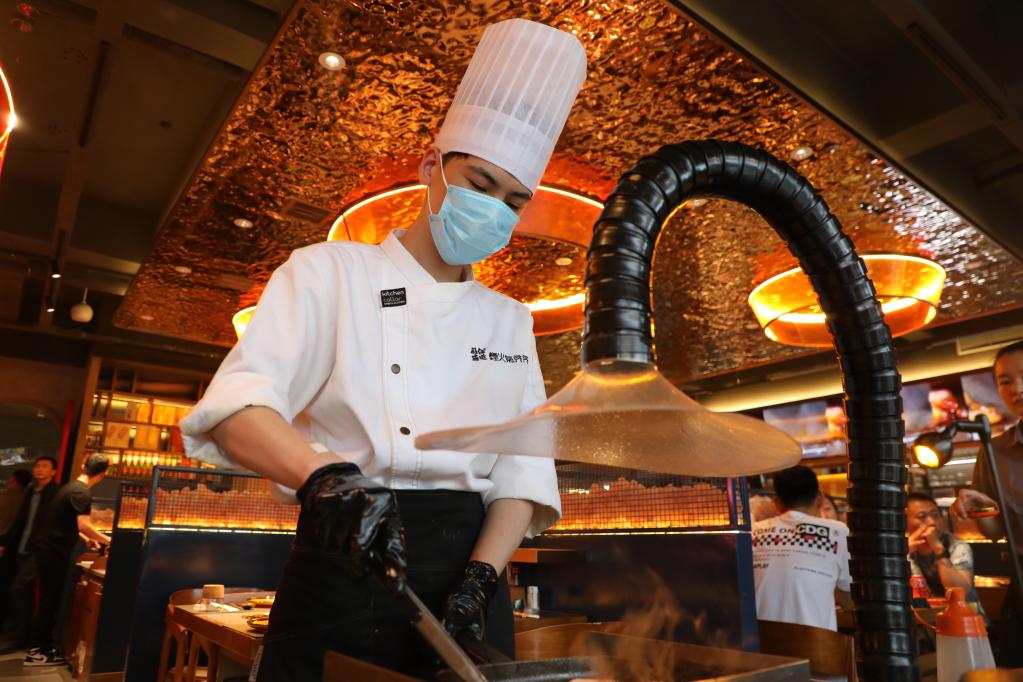 在齊齊哈爾市一家烤肉店,廚師正在為顧客制作烤肉。新華社記者唐鐵富 攝