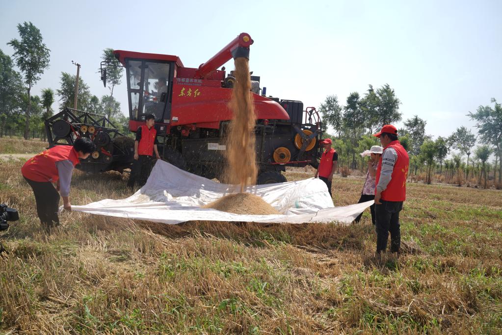 在河北邢臺經濟開發區的一處麥田,志愿者正在幫助農民收小麥。新華社記者 鄒尚伯 攝