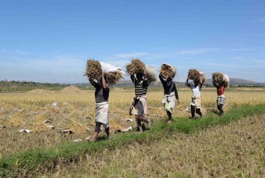 2023年5月12日,在馬達加斯加首都塔那那利佛附近馬希奇鎮的中國國家雜交水稻工程技術研究中心非洲分中心,當地農民在雜交水稻高產示范田內收割水稻。新華社發(西塔卡·拉喬納里松攝)