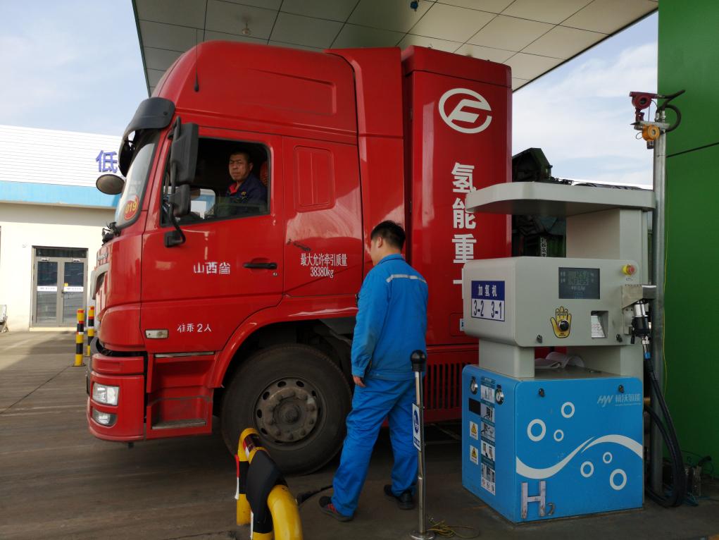 在山西曲沃“氫能小鎮”,加氫站工作人員正在為氫能重卡加注氫氣。新華社記者王飛航 攝