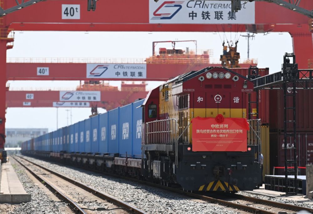 2023年8月3日,中歐班列(西安-塔什干)陜烏經貿合作隆基綠能光伏組件出口專列在西安國際港站準備發車。新華社記者 鄒競一 攝