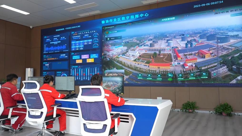 在河北省任丘市華北油田第一采油廠輸油作業區區域指揮中心,大屏上顯示著油水井、站場、管道等數據信息。利用“井站駕駛艙監控、云組態站控、AR實景監控、消防安保聯動、管道運行監控”五大功能系統,使油水井、站場的隱患處理效率同比提高30%。