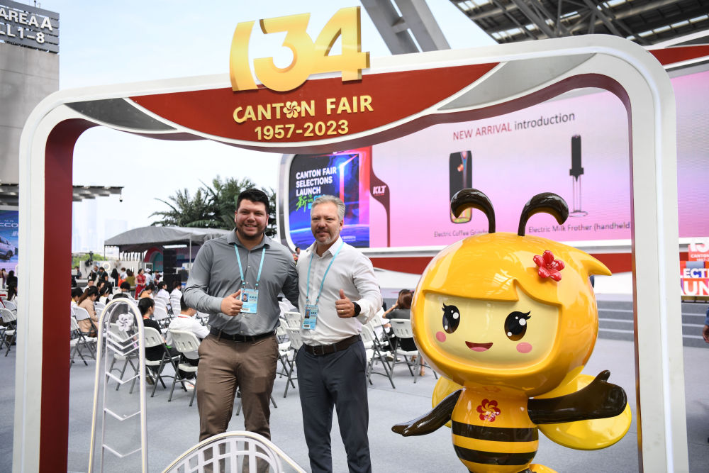 2023年10月15日,來自巴西的采購商在廣交會上合影。新華社記者 鄧華 攝