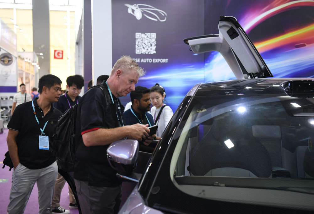 2023年10月16日,外國采購商觀看廣交會中國新能源汽車展臺。新華社記者 鄧華 攝