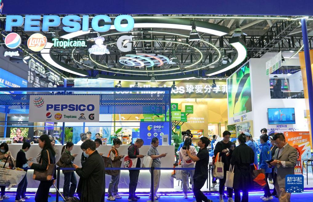 2023年11月8日在第六屆進博會食品及農產品展區拍攝的百事公司展臺。今年是百事公司首次參展進博會。新華社記者 劉穎 攝