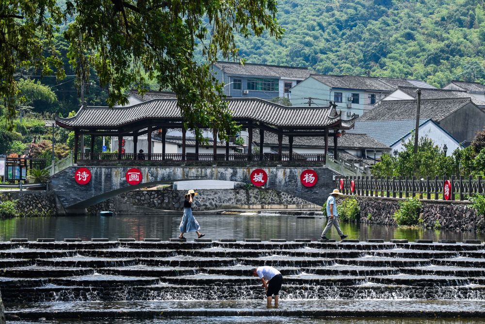 2023年8月10日,游客在浙江省寧波市鄞州區城楊村的溪流玩耍。新華社記者 徐昱 攝