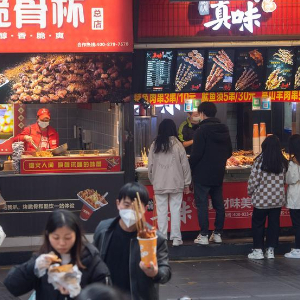 2023年12月23日,在位于重庆解放碑商圈的八一路好吃街上,市民游客挑选小吃美食。新华社记者 唐奕 摄
