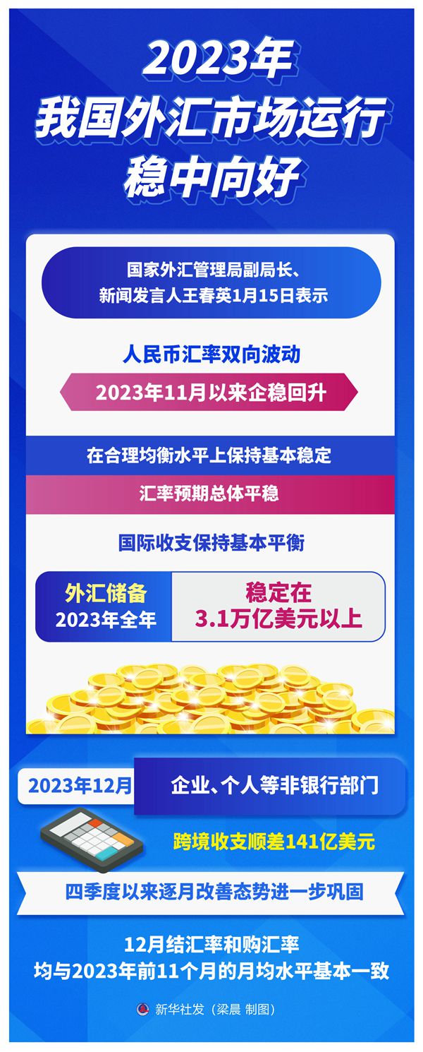 新华社北京1月15日电(记者刘开雄)“2023年我国外汇市场运行稳中向好、表现出较强韧性。”国家外汇管理局副局长、新闻发言人王春英15日表示,人民币汇率双向波动,2023年11月以来企稳回升,在合理均衡水平上保持基本稳定,汇率预期总体平稳;国际收支保持基本平衡,外汇储备2023年全年稳定在3.1万亿美元以上。