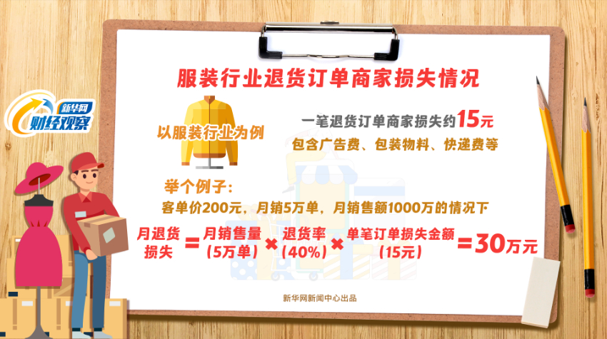 他算了一笔账,服装行业一笔退货订单,在没有收益情况下要付出成本约15元,等于广告费、包装物料、快递费的投入直接打水漂。如果按照销售1000万元,客单200元,保守算40%退货,因退货产生的损失达30万元以上,连带成本每月损失过百万。
