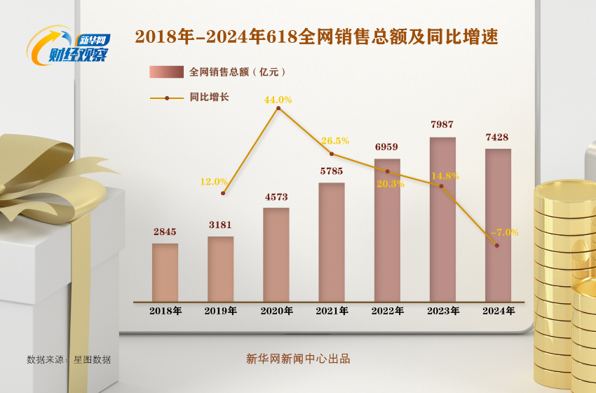 根据星图数据,今年“618”全网销售总额为7428亿元,而去年为7987亿元,同比下降7%。其中,综合电商天猫、京东和拼多多共5717亿元,同比下降6.9%。