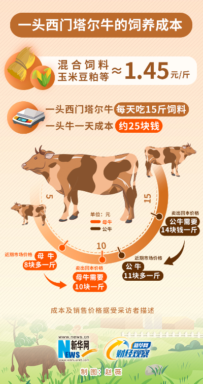 张万贵给记者算了一笔账:养牛需要玉米、豆粕、麸皮等,但这些饲料原料价格均未下降,混合饲料和玉米豆粕等成本合计1.45元/斤,一头西门塔尔牛每天吃15斤饲料,养一头牛一天的成本约25块钱。综合测算,母牛价格10元/斤,公牛14元/斤才能收回成本。但近期市场价格,母牛出栏价8块多一斤,公牛11块多一斤。