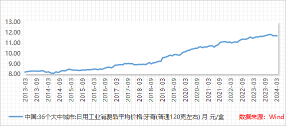 Wind数据显示,国家发改委发布的36个大中城市普通120克左右牙膏的平均价格2013年1月31日8.16元/盒,2020年1月31日10.00元/盒,2024年3月31日达到11.68元/盒。