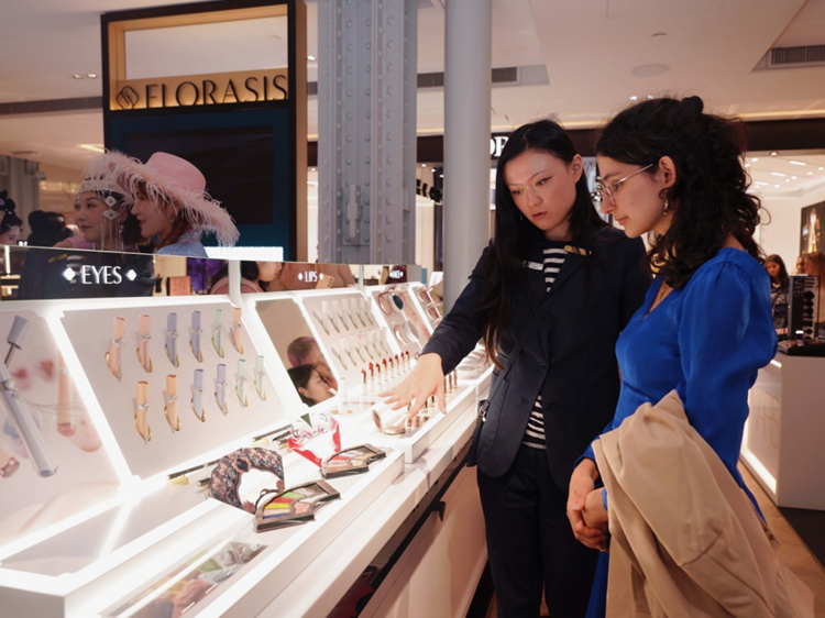 图为消费者在巴黎百货商场莎玛丽丹内的花西子专柜前选购商品(品牌提供)