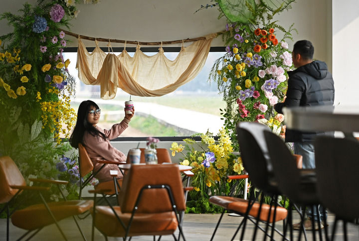 2024年12月3日,游客在浙江省桐庐县梅蓉村乡村会客厅宏逸咖啡馆拍照打卡。新华社记者 卢哲 摄