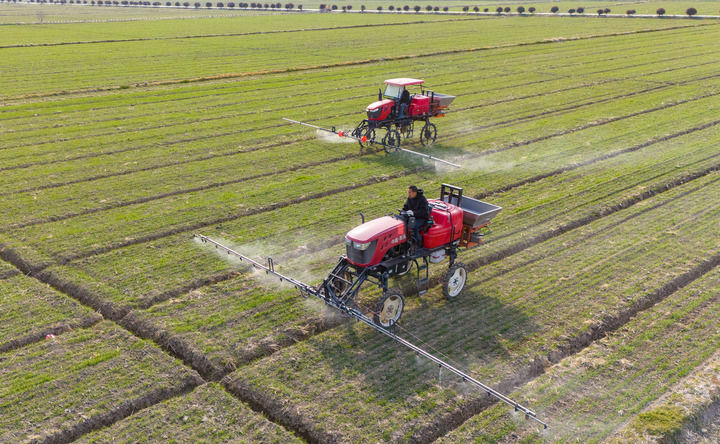 2025年2月20日,在江苏省南通市通州区十总镇育民村高标准农田,农民驾驶植保机械对进入返青期的小麦开展病虫害防治作业(无人机照片)。新华社发(翟慧勇摄)