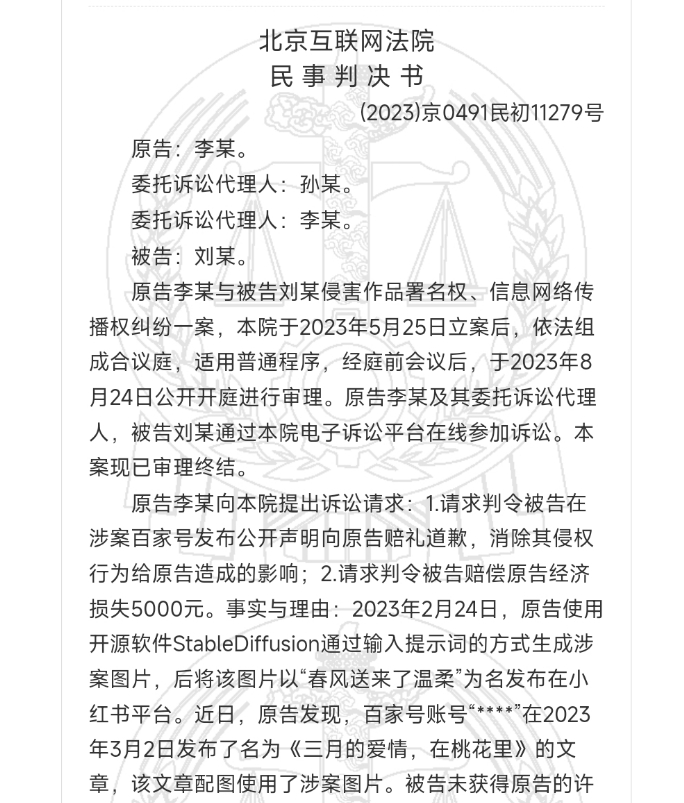 2023年末,北京互联网法院审结了一起作品署名权和信息网络传播权纠纷案件,首次明确了利用人工智能生成图片“作品”的属性,AI使用者享有该作品的著作权,并受到著作权法的保护。