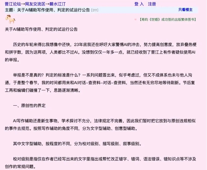 晋江文学城发布《关于AI辅助写作使用、判定的试行公告》