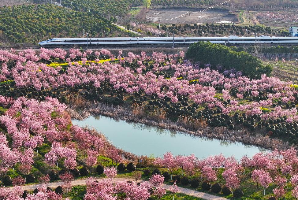 2025年3月19日,一列高铁列车行驶在安徽省合肥市肥东县长临河镇合福高铁线路上(无人机照片)。新华社记者 杜宇 摄