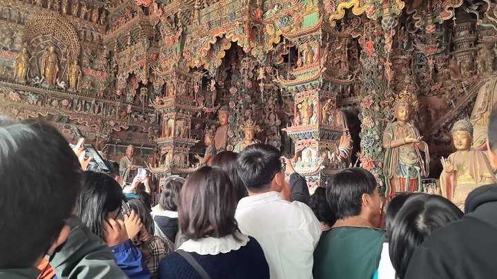 游客在山西省隰县小西天景区欣赏满堂悬塑。(2024年10月5日拍摄)新华网 发(刘英摄)