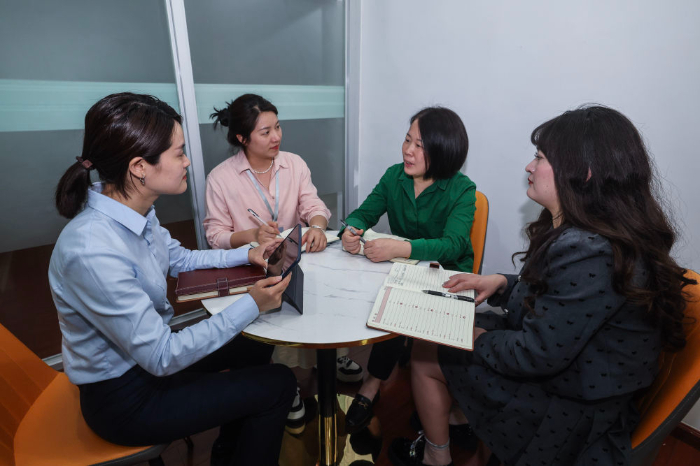 2025年4月17日,在浙江星程吉月智能科技有限公司,浙江杭州市富阳经济技术开发区助企服务专员(左二)、富阳农商银行工作人员(左一)上门解决企业融资需求。新华社记者 徐昱 摄