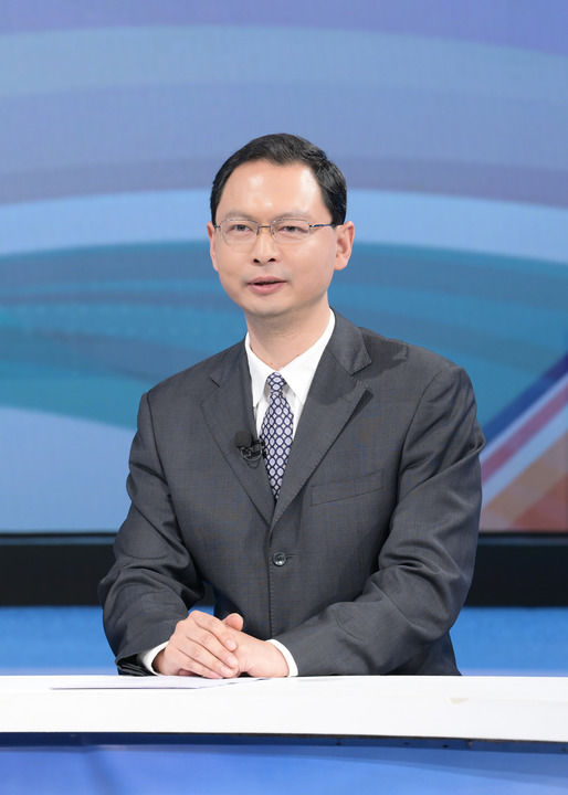 外交部领事司副司长童学军在第十七期“中国经济圆桌会”大型全媒体访谈节目录制现场发言。新华社记者 李贺 摄