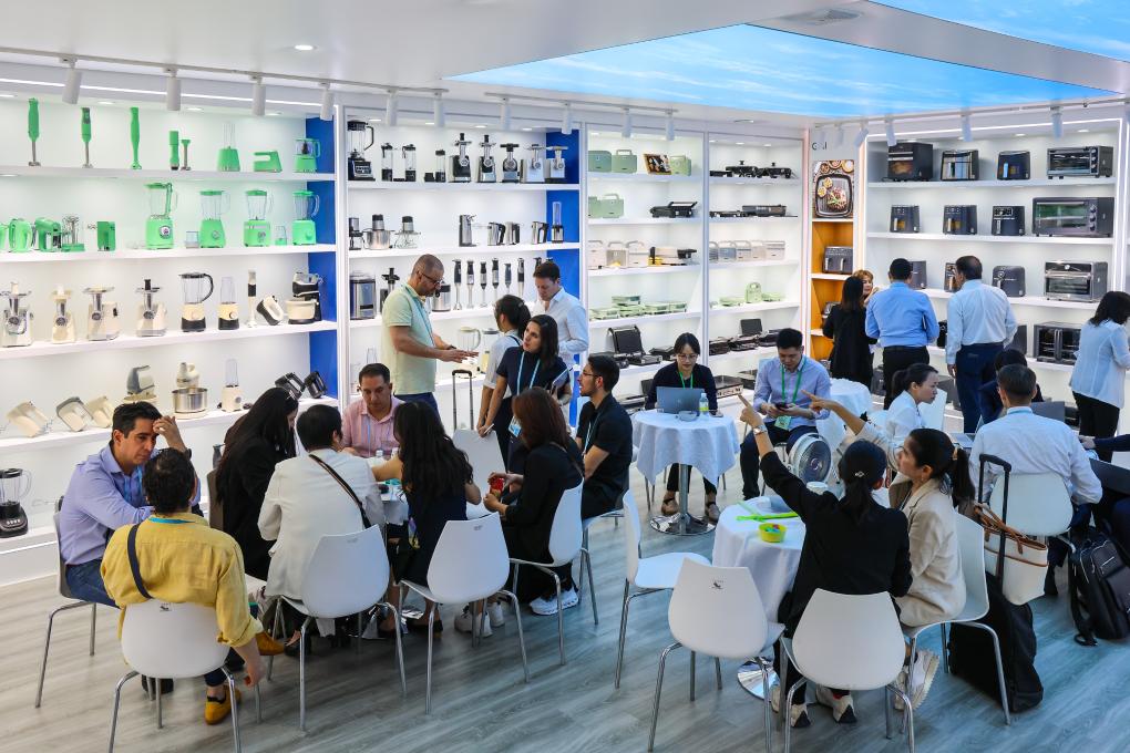 在第137届广交会上,新宝股份展区的全类目电器产品吸引众多采购商洽谈采购(4月15日摄)。