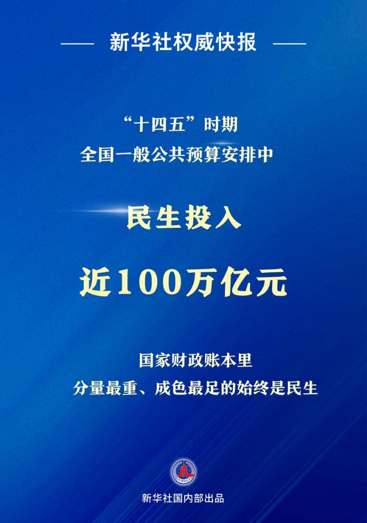 数据显示,“十四五”时期,全国一般公共预算安排教育支出20.5万亿元,社会保障和就业支出19.6万亿元,卫生健康支出10.6万亿元,住房保障支出4万亿元,加上其他领域支出,财政民生投入近100万亿元。
