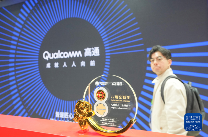 11月6日,观众在第八届进博会技术装备展区高通展台参观。高通是进博会八届“全勤生”。新华社记者 任鹏飞 摄