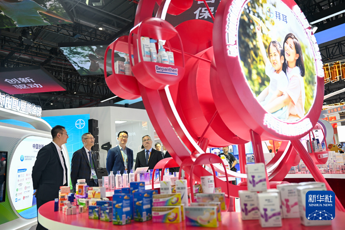 11月7日,观众在医疗器械及医药保健展区拜耳展台参观。拜耳是进博会八届“全勤生”。新华社记者 陈浩明 摄