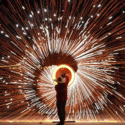 2026年2月18日,在河南省安阳市内黄县文化体育中心,民间艺人表演打铁花。新华社发(刘肖坤摄)