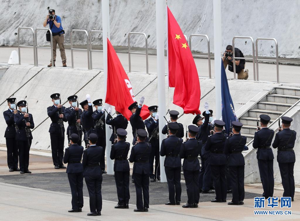 上午10時許,在香港警察學院,隨著警察樂隊奏響《歌唱祖國》,國旗方隊踢正步入場?!跋蛴铱待R”“向前看”“向國旗敬禮”,在雄渾有力的口令指揮下,國旗方隊迅速完成轉體轉身、立定靠腳等一系列動作。