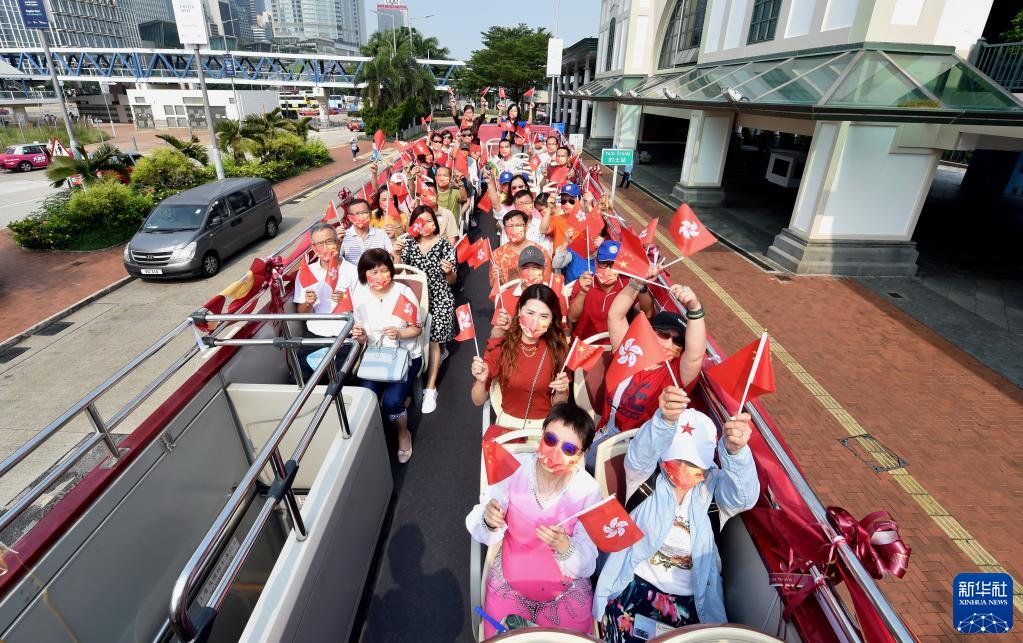 10月1日,在香港街頭,參加慶祝國慶巴士巡游的人們揮動國旗和香港特區(qū)區(qū)旗。新華社記者 盧炳輝 攝