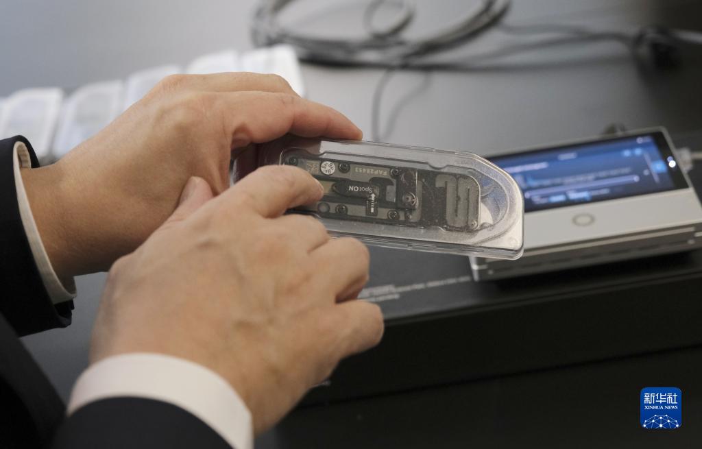 12月1日,在香港中文大學,創新診斷科技中心領頭人、中大醫學院盧煜明教授介紹小型檢測儀器。新華社記者 王申 攝
