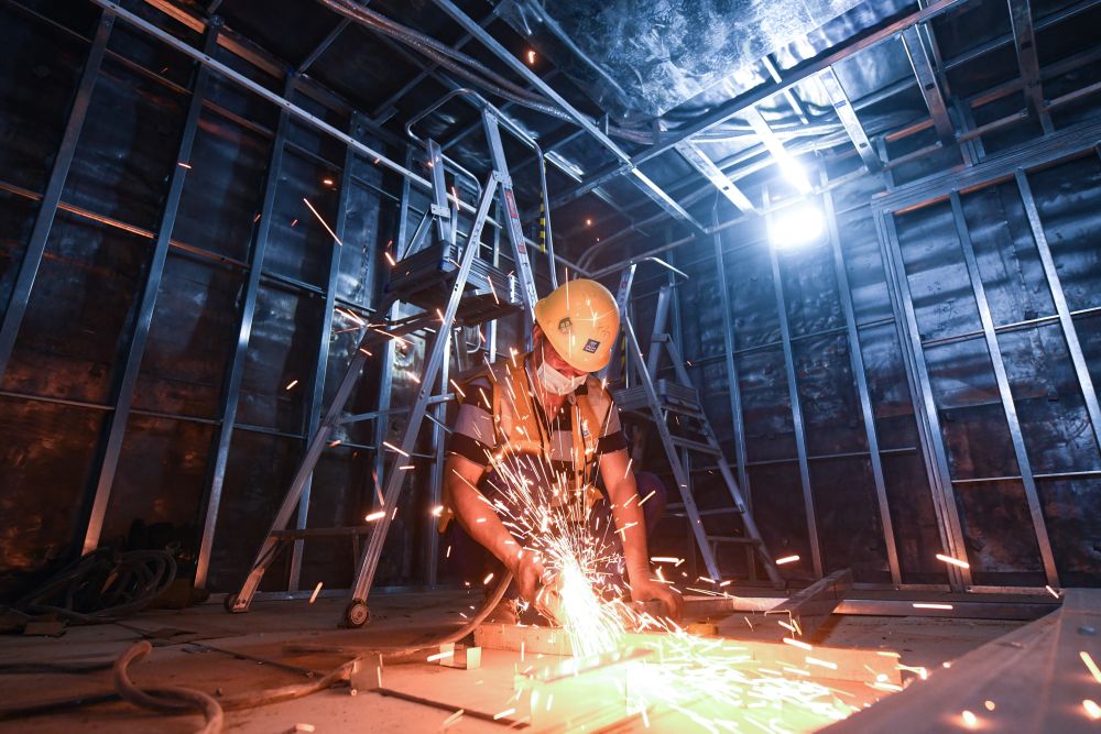 3月27日,工人在建設中的應急醫院CT室里作業。