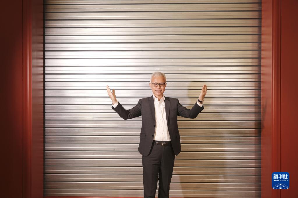 2022年4月22日,香港故宮文化博物館館長吳志華伸展雙臂用肢體語言表達(dá)香港故宮文博館是一座“連結(jié)的博物館”。 新華社記者 王申 攝