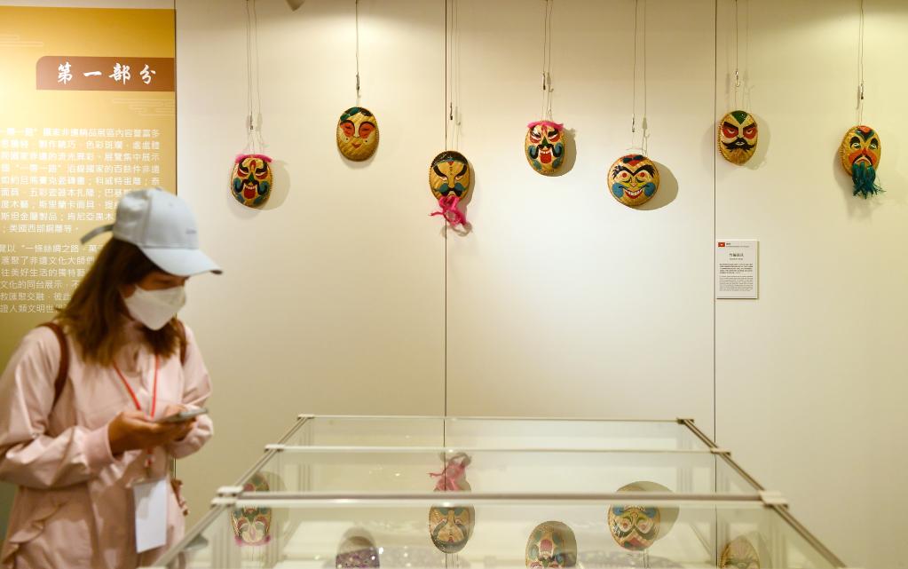 本次活動展覽現(xiàn)場共分為三個展區(qū):多彩絲路——“一帶一路”沿線國家非遺精品展區(qū)、國風潮韻——中華非遺傳承精品展區(qū),以及源遠流長——文房書齋精品展區(qū),陳列300余件非遺文化代表作與精品,體現(xiàn)中華文化“和而不同”“美美與共”的開放包容價值觀。