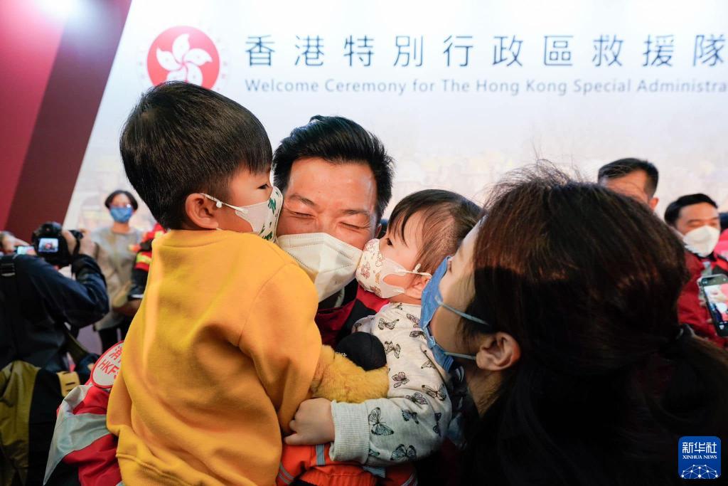 2月17日,在香港特區救援隊赴土耳其救災返港儀式上,救援隊隊員與親友相見。新華社發