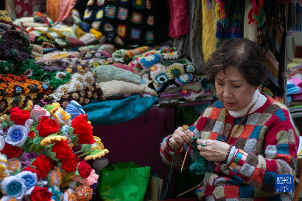 香港灣仔太原街露天市集毛衣毛線制品攤位老板楊麗萍在編織毛線(2月15日攝)。新華社記者 龍鏡伊 攝