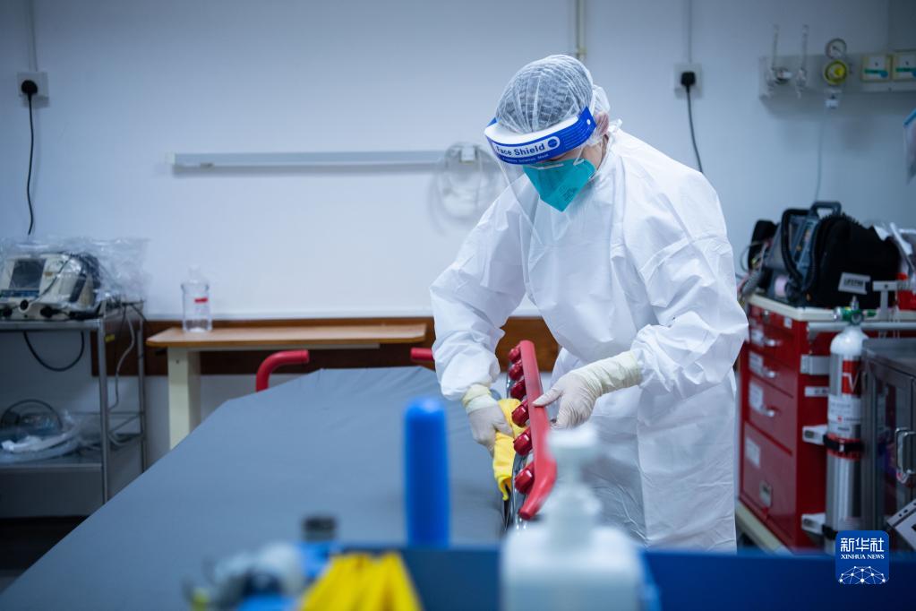 湖北麻城人方玲在澳門仁伯爵綜合醫院進行清潔服務(4月24日攝)。新華社記者 張金加 攝