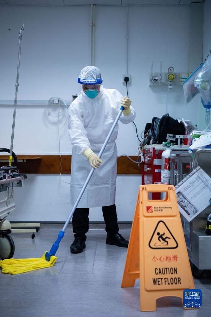 四川廣安人彭友明在澳門仁伯爵綜合醫院進行清潔服務(4月24日攝)。新華社記者 張金加 攝