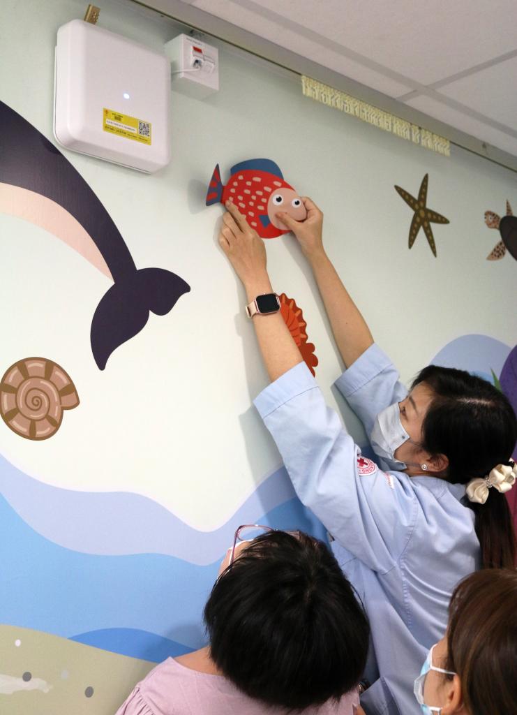 高卓翹老師(上)和學生一起裝飾病房墻壁(資料照片)。 新華社發